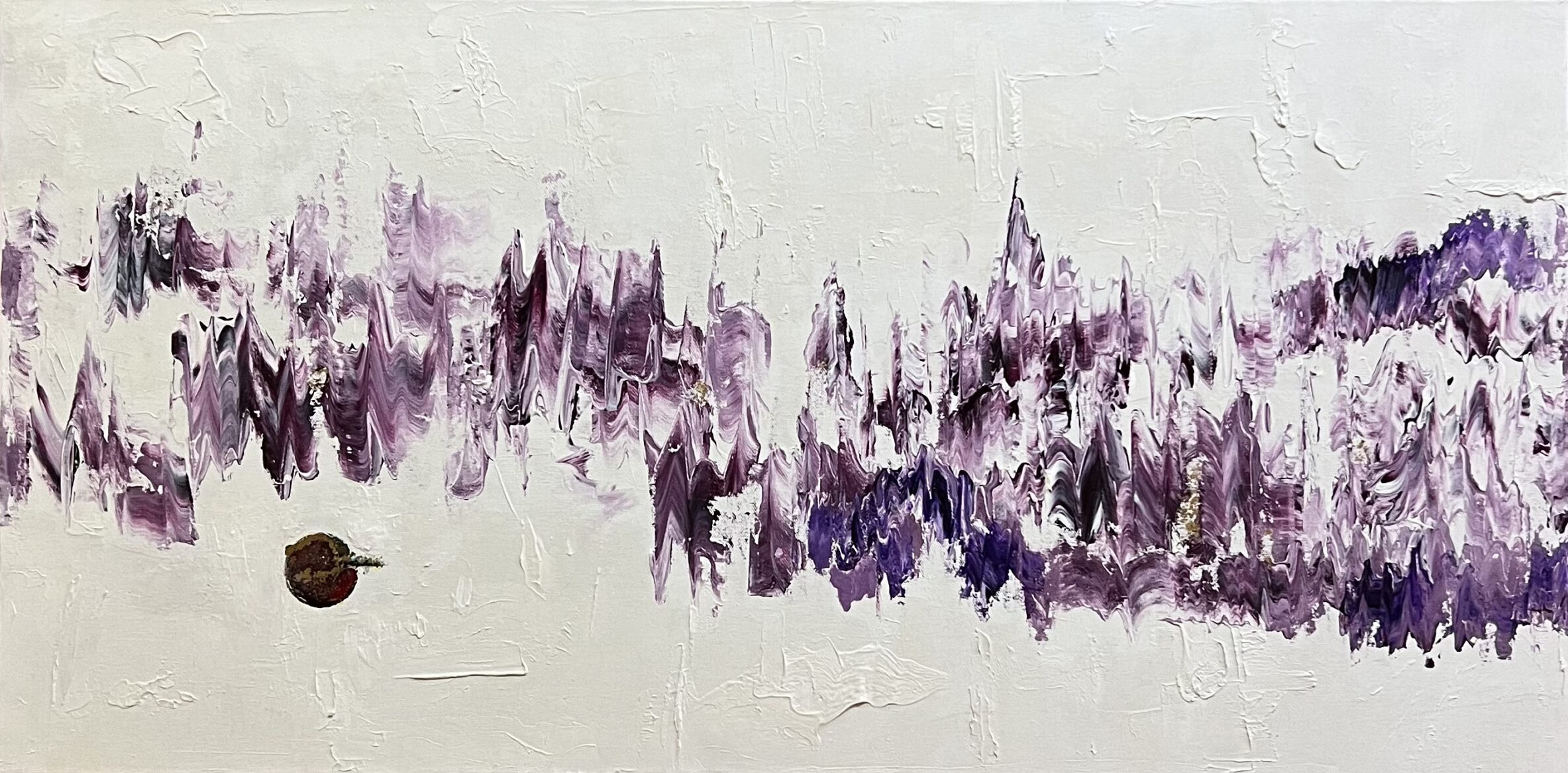 Amethyst description: “Healing frequency to soothe the mind and draw in creative energy and insight. The movement of the piece represents the flow of energy. The field of white denotes purity and clarity.”